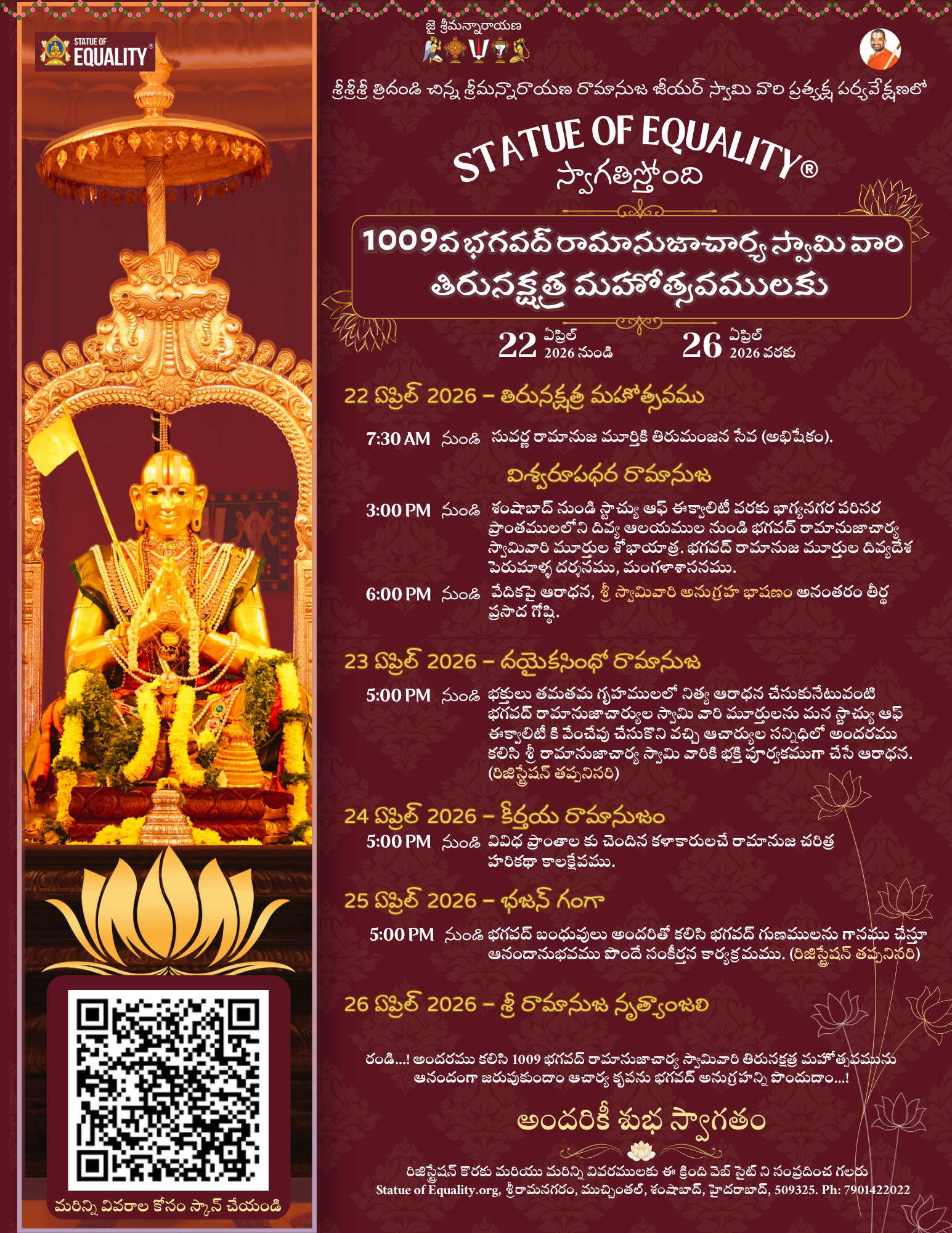 Grand procession from Shamshabad to the Statue of Equality, followed by Sri Ramanuja Murthula Aaradhana.